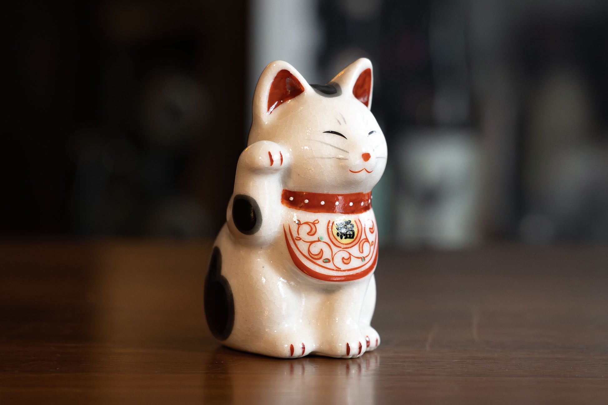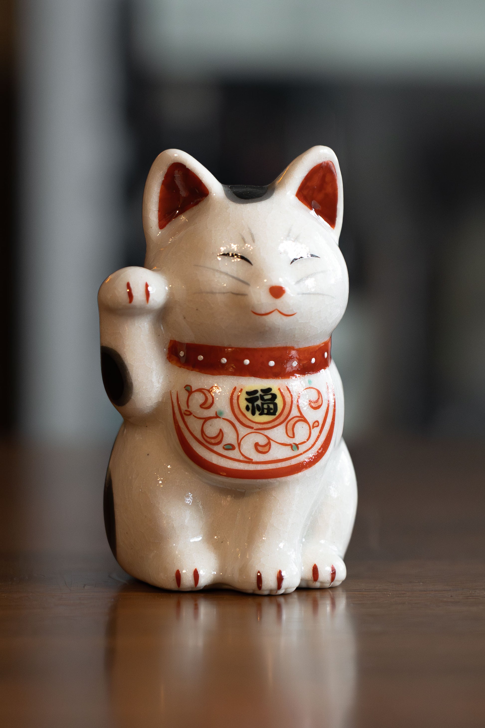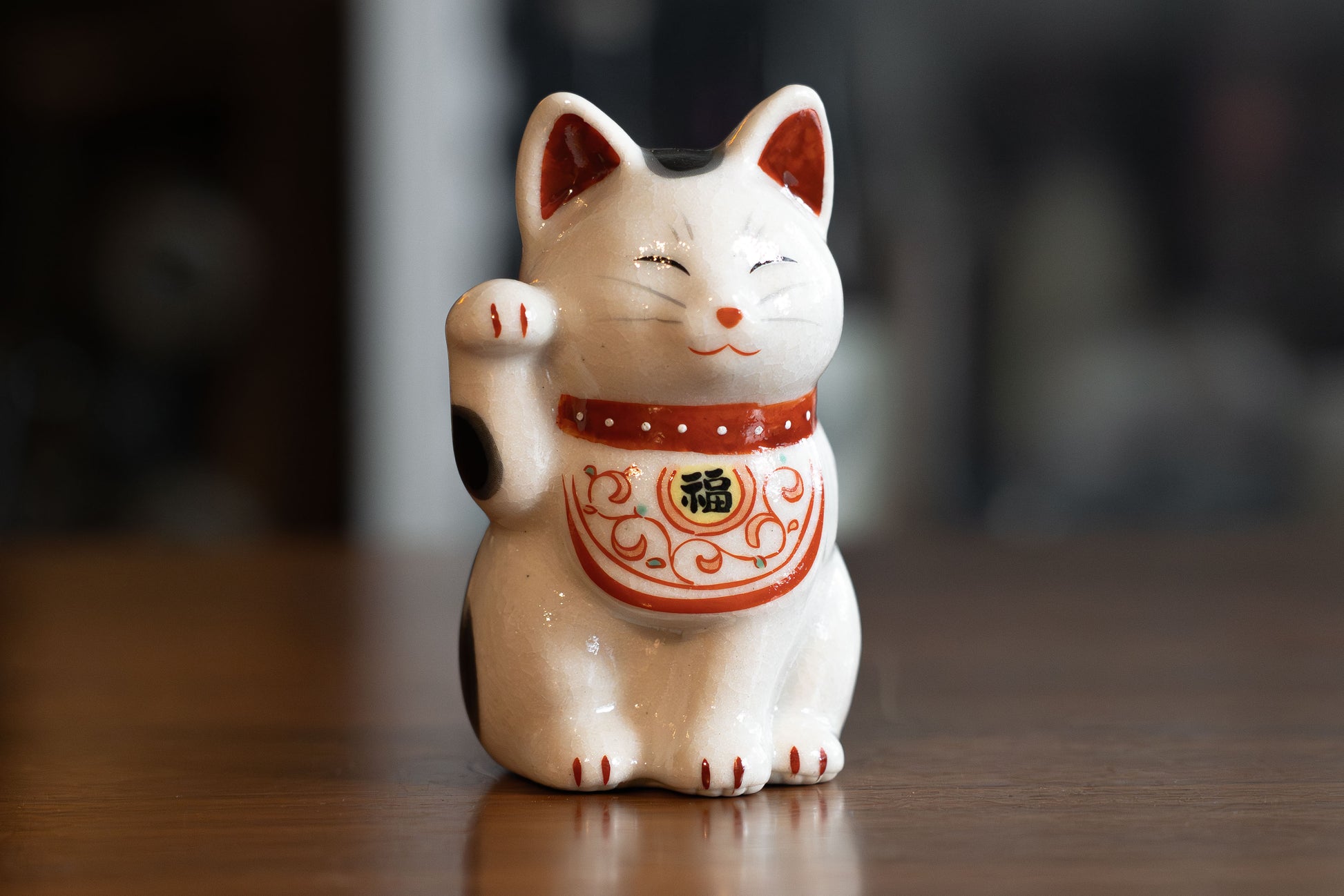 招財貓的形像是手持 "工班",但早期的招財貓並沒有 "工班",大多數招財貓的衣領上都掛著一個鈴鐺。據說,這種鈴鐺後來逐漸變成了 "呼班"。公盤上繪有金額和 "開運"、"福祿 "等吉祥語,直接反映了招財貓的願望。有趣的是,隨著時間的推移,招財貓上描繪的錢數也在不斷增加,從 [千兩] [萬兩] [萬兩] 到 [億兩]。基本上,金額越少,就越被認為是年代久遠的古板。