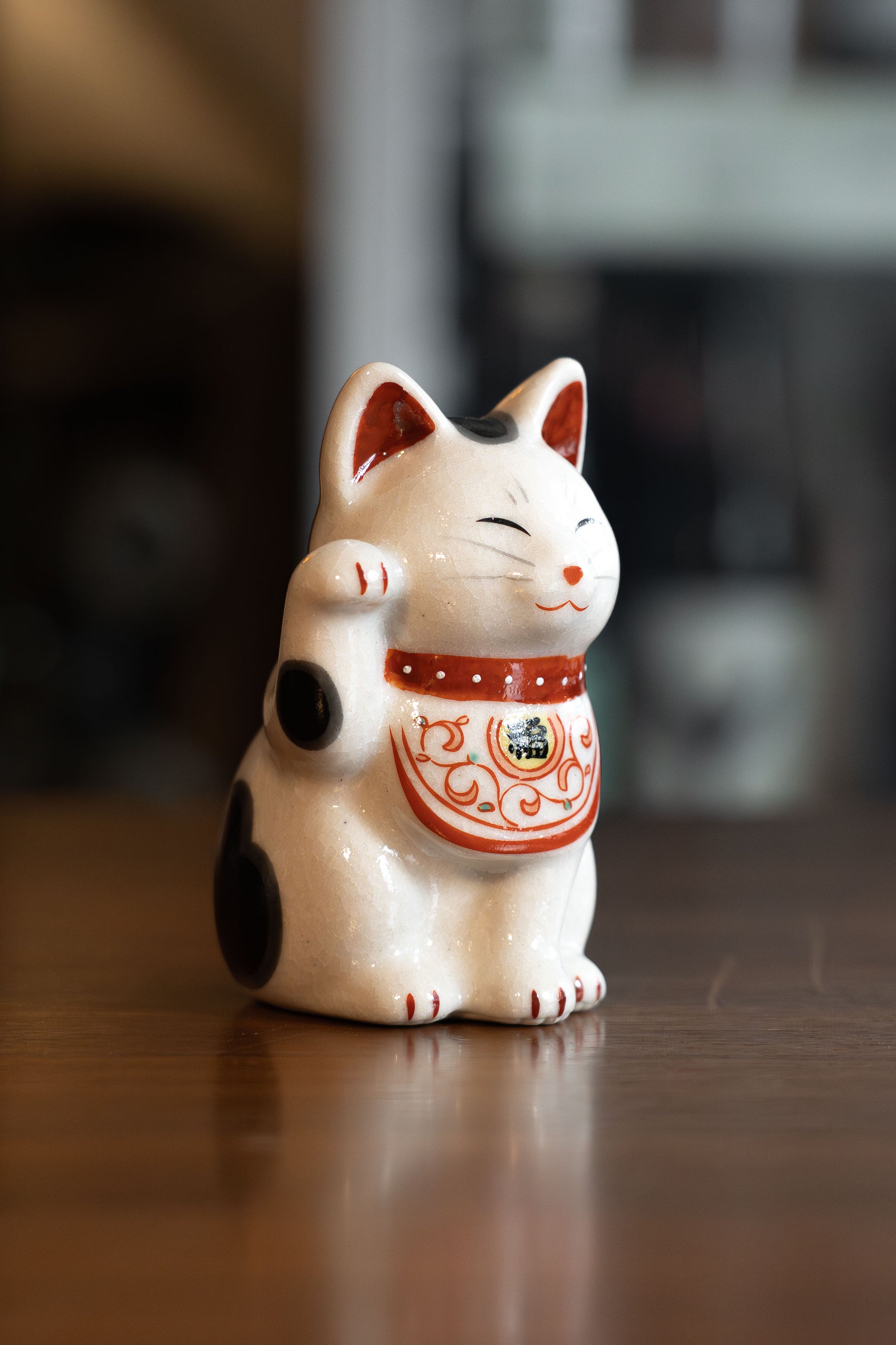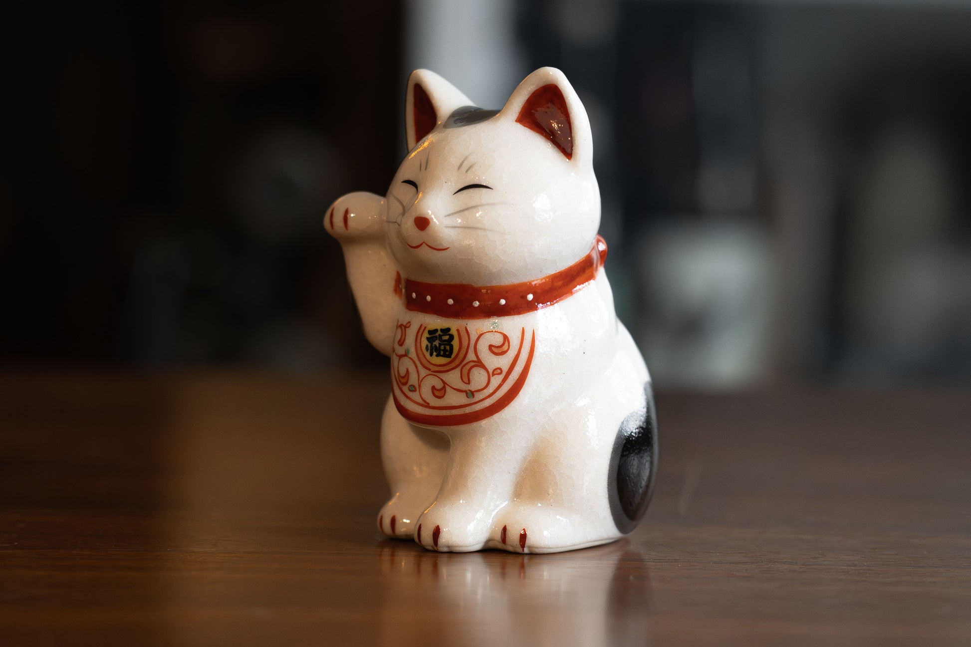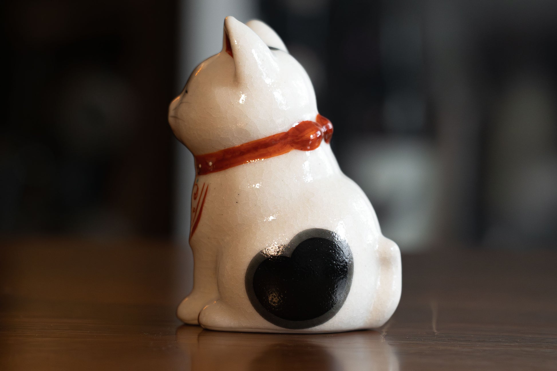 招財貓的形像是手持 "工班",但早期的招財貓並沒有 "工班",大多數招財貓的衣領上都掛著一個鈴鐺。據說,這種鈴鐺後來逐漸變成了 "呼班"。公盤上繪有金額和 "開運"、"福祿 "等吉祥語,直接反映了招財貓的願望。有趣的是,隨著時間的推移,招財貓上描繪的錢數也在不斷增加,從 [千兩] [萬兩] [萬兩] 到 [億兩]。基本上,金額越少,就越被認為是年代久遠的古板。