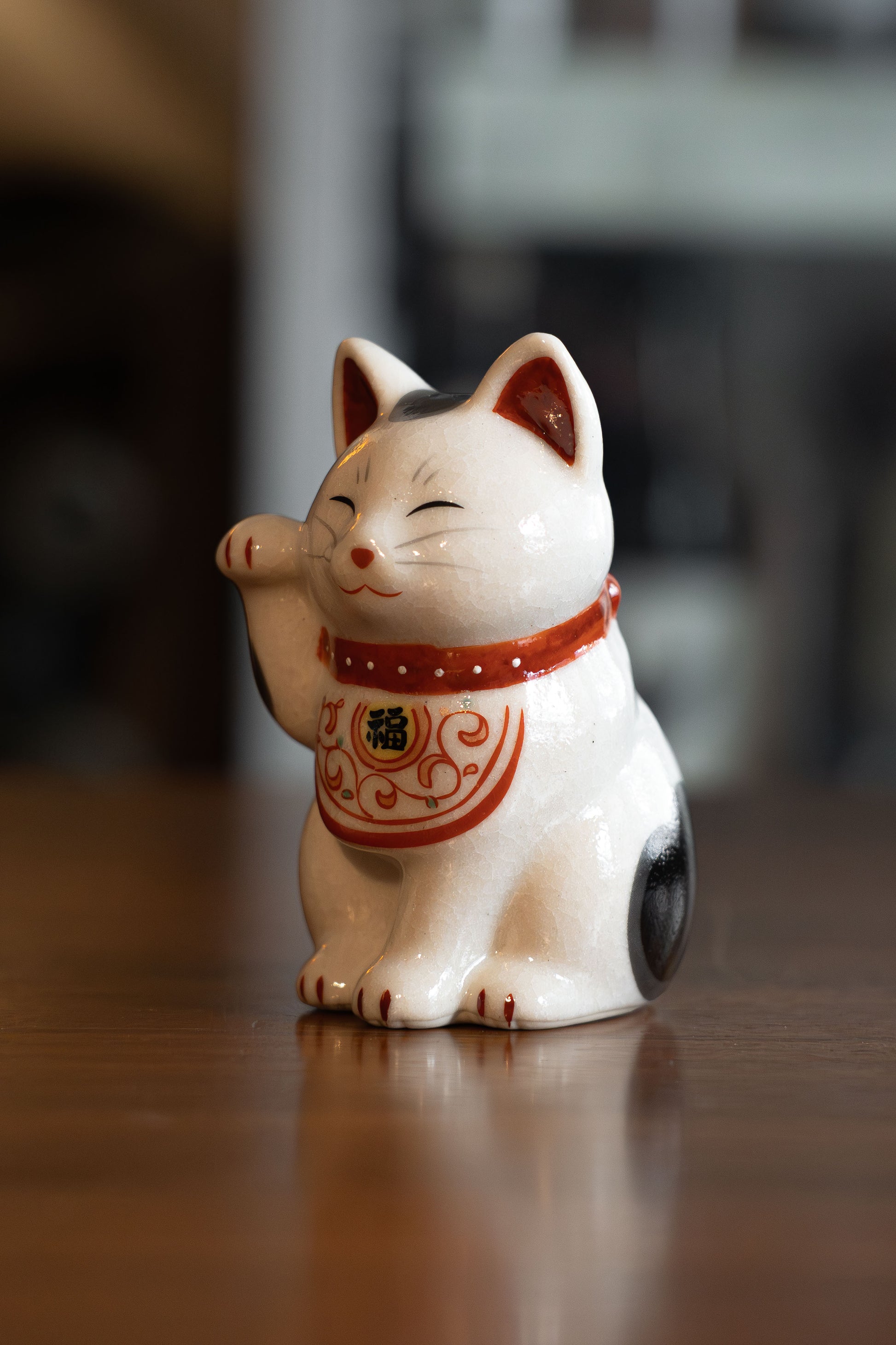 舉起左手的招財貓是一隻招人進門的貓。因此,招財貓經常被擺放在餐館、服務行業等顧客較多的地方。